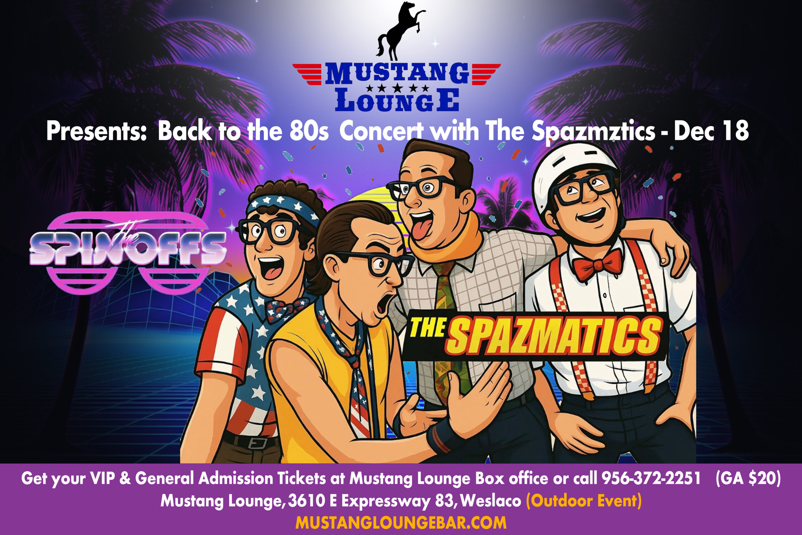 🎸 Mustang Lounge Presents: Back to the 80s with The Spazmatics! 🎸 Get ready for a totally tubular night! On Thursday, December 18, 2025, The Spazmatics take over Mustang Lounge for a high-energy Back to the 80s concert that’ll have you singing, dancing, and laughing all night long. From synth-pop classics to hair-band anthems, The […]